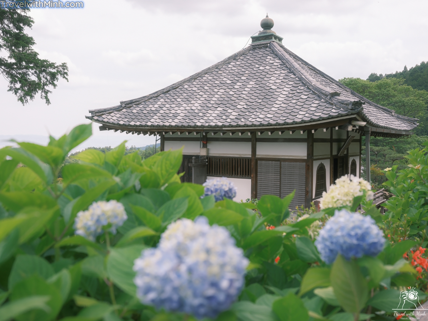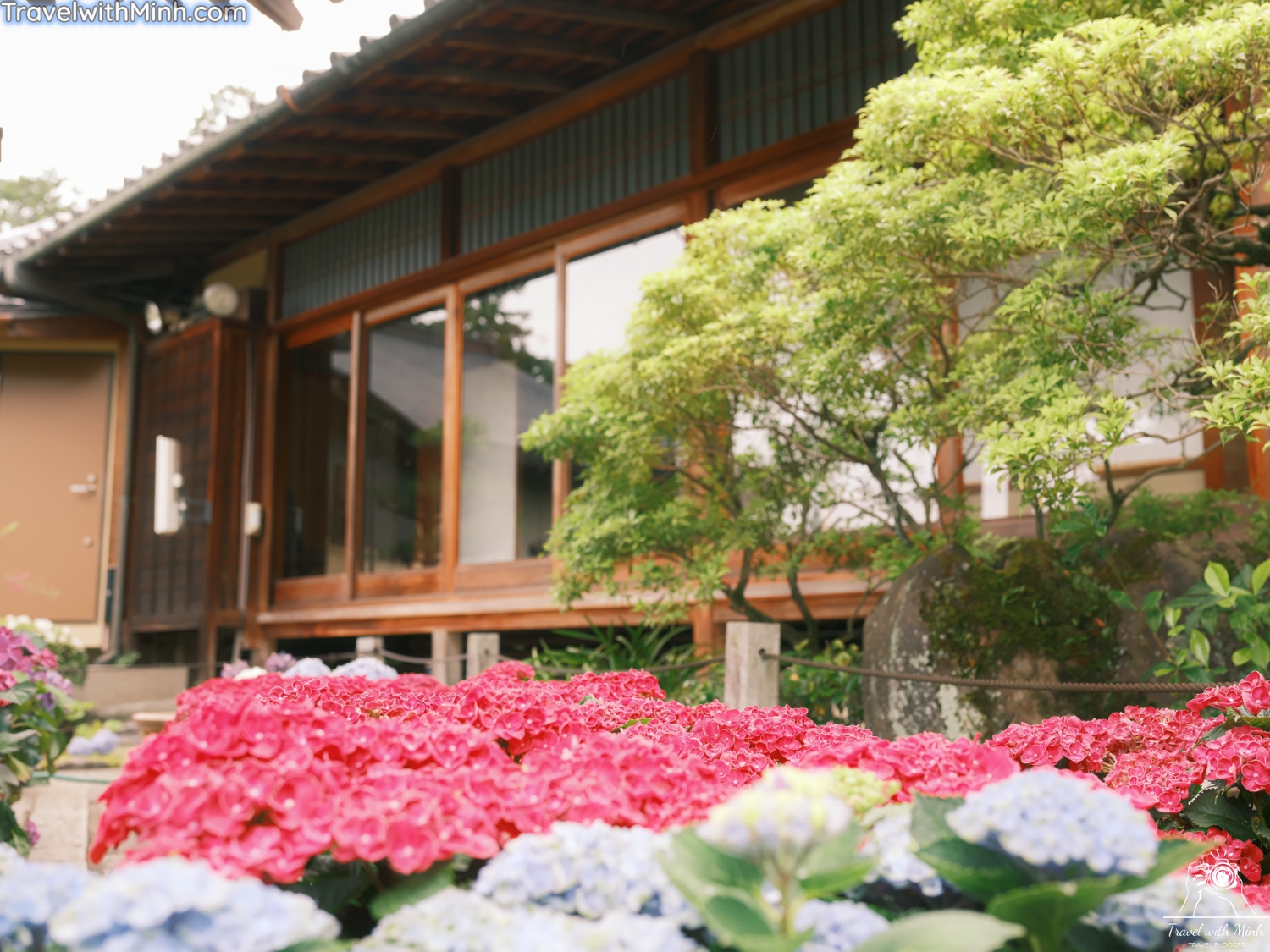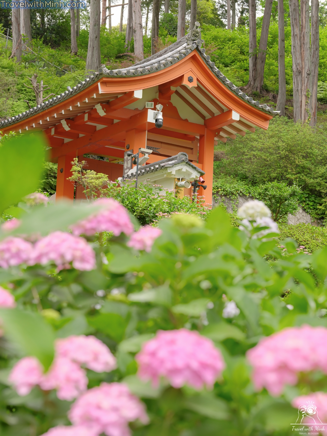 Nằm ở phía trong cùng khuôn viên là một ngôi chùa ba tầng màu đỏ, là điện thờ Phật A Di Đà. Và cuối cùng, xem các góc chụp hoa cẩm tú cầu ở ngôi chùa này nhé.