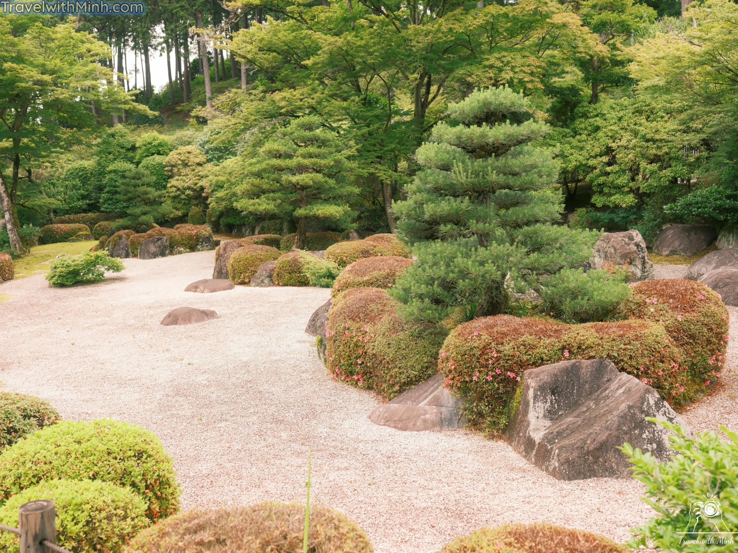 Nằm giữa khu vực điện chính của ngôi chùa, với khu vực vườn hoa cẩm tú cầu, bạn sẽ đi ngang qua một khu vườn kiểu Nhật, với khung cảnh đậm chất truyền thống, như lá đỏ, cây bonsai, ao cá Koi, …