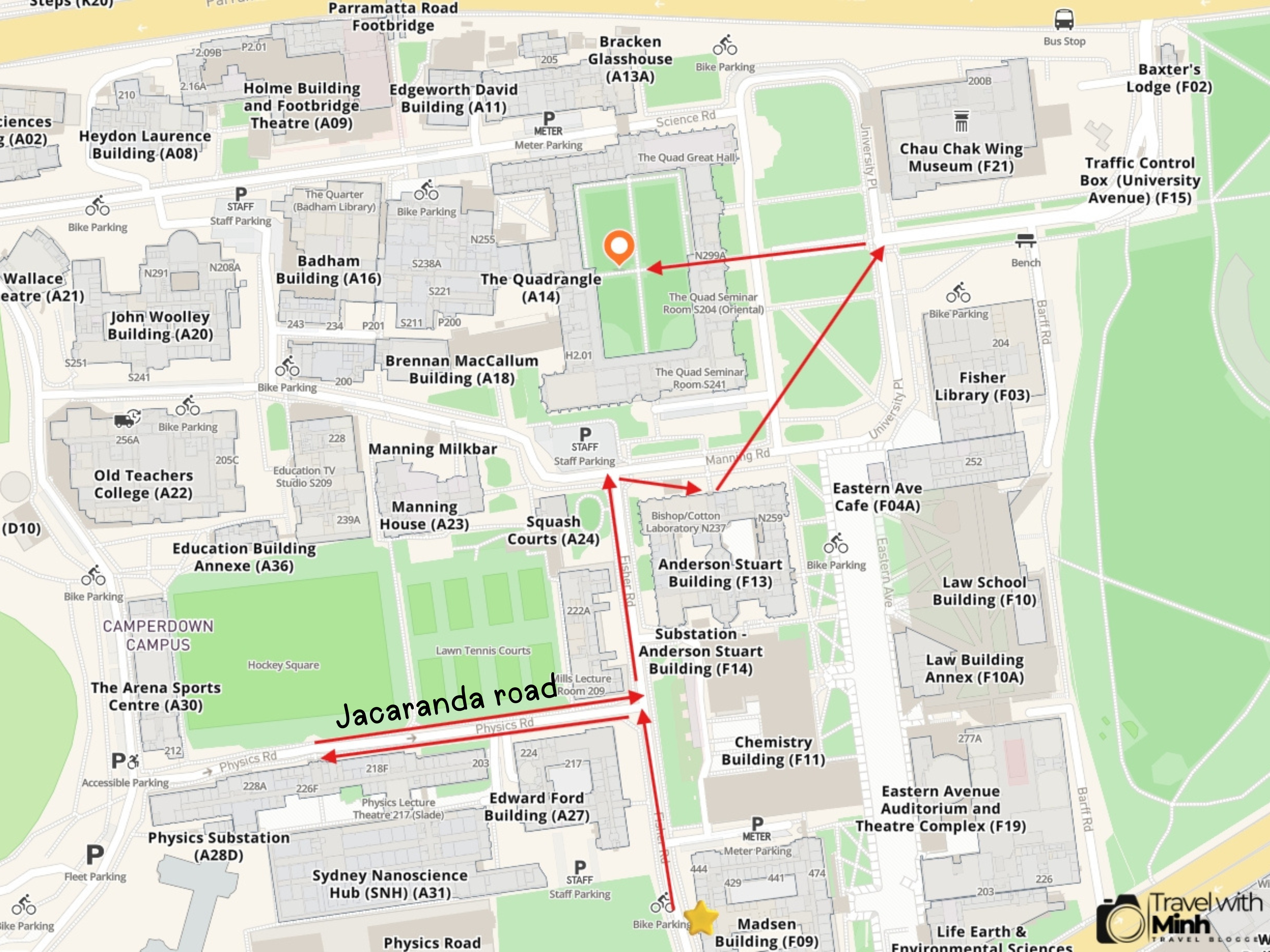 Mình sẽ để bản đồ các địa điểm mình sẽ chụp ngày hôm nay phía dưới đây cho các bạn dễ tìm nhé. Bản đồ mình lấy từ website của trường, các bạn có thể tham khảo thêm vị trí các toà nhà khác của trường tại: https://maps.sydney.edu.au/