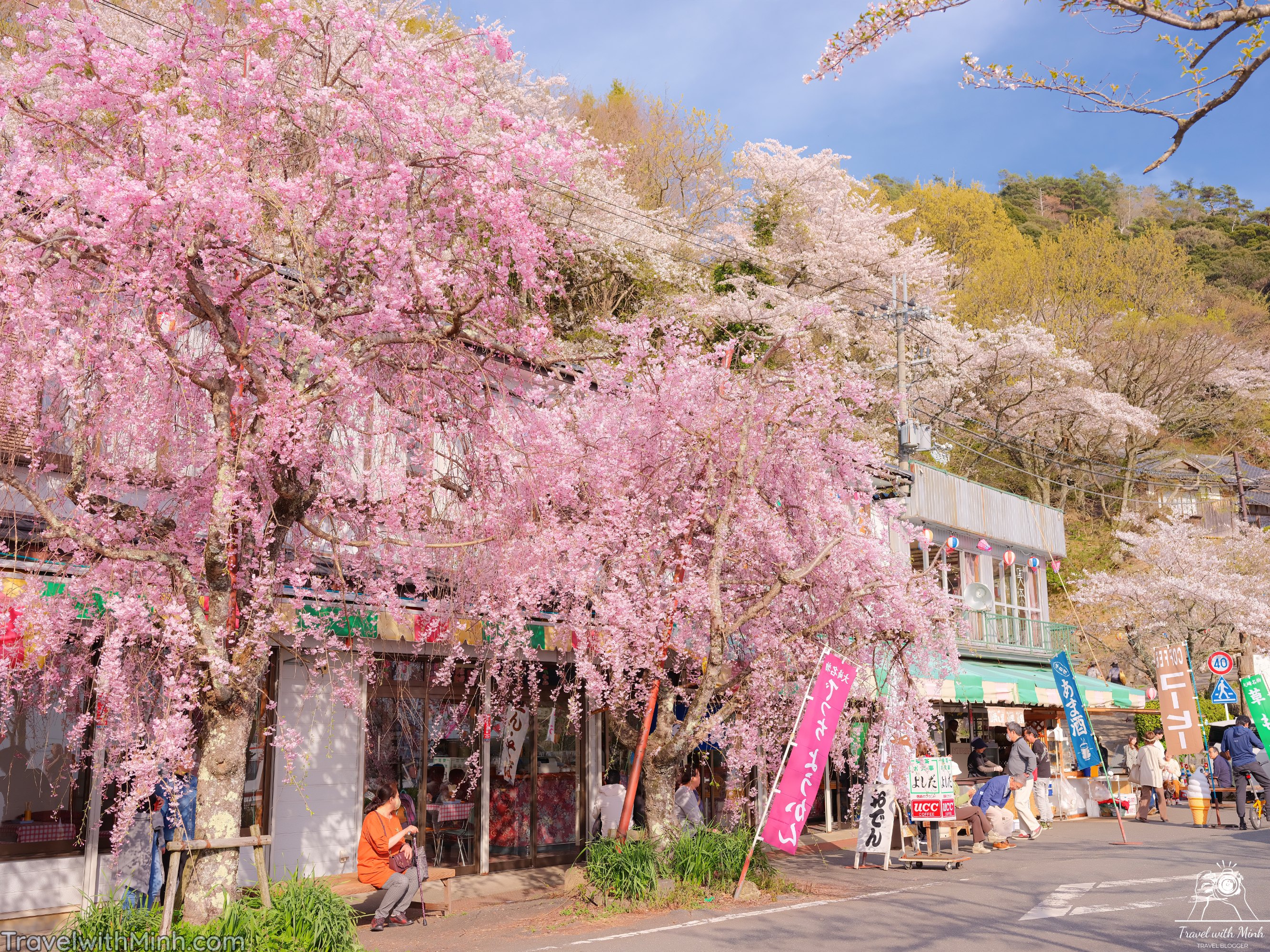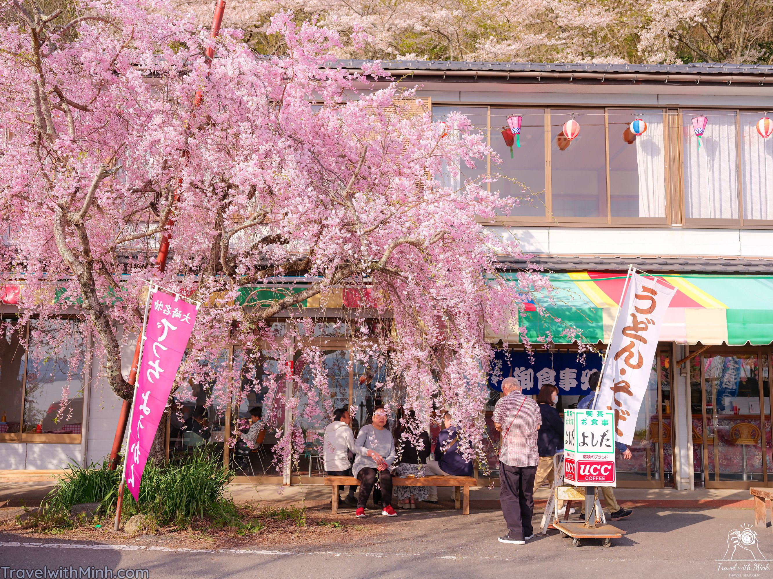 Ngoài ra, cũng tại đó có rất nhiều nhà hàng ăn uống mà bạn có thể thử. Ở đây phục vụ các món như Udon, tempura, hạt dẻ nướng, hay các món hải sản, … Phía trước nhà hàng cũng là hai cây đào rủ cực to, và có màu hồng đậm rất đẹp.