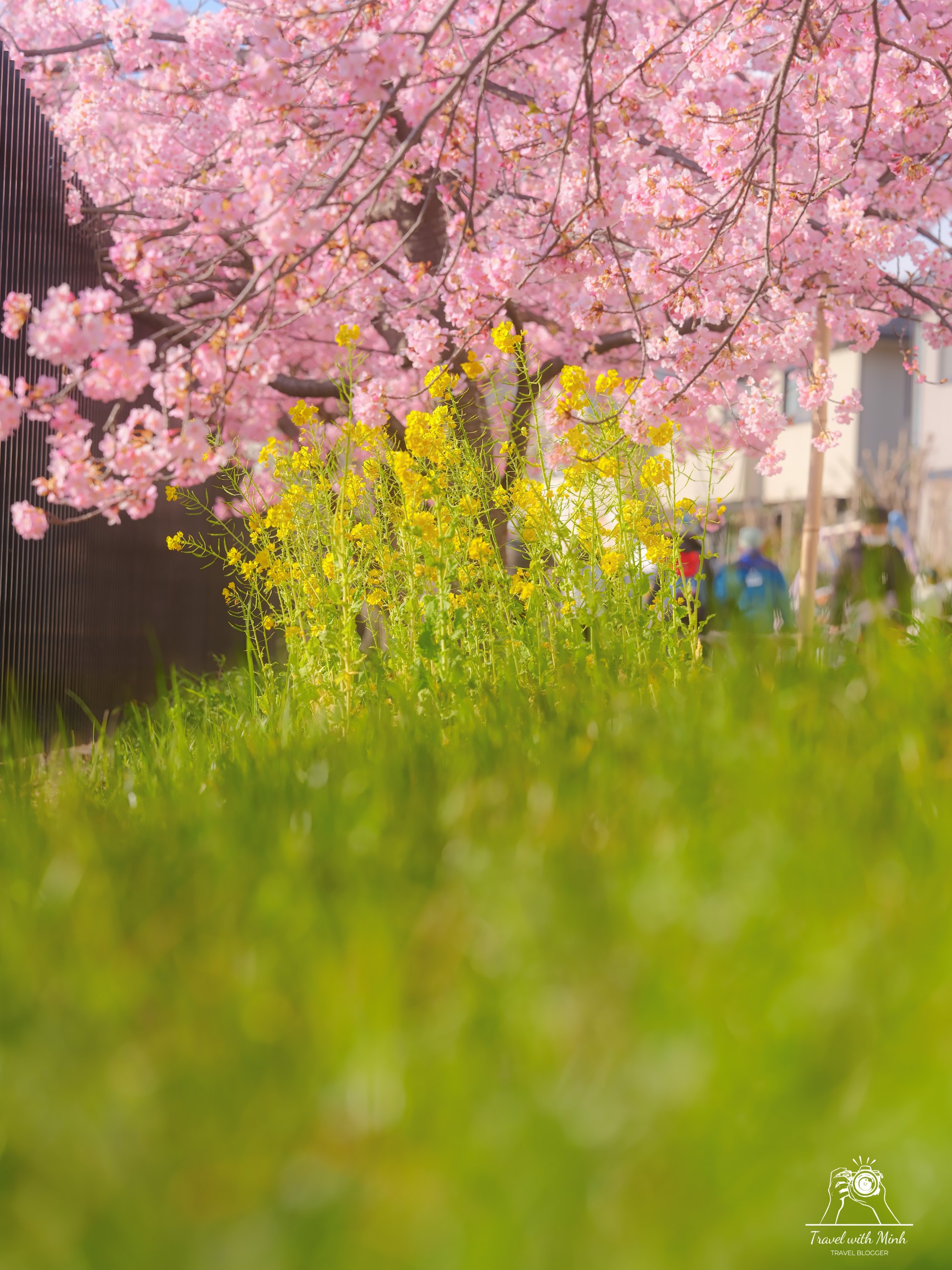 Ngoài hoa anh đào, thì hoa cải cũng đang nở rộ tại đây.