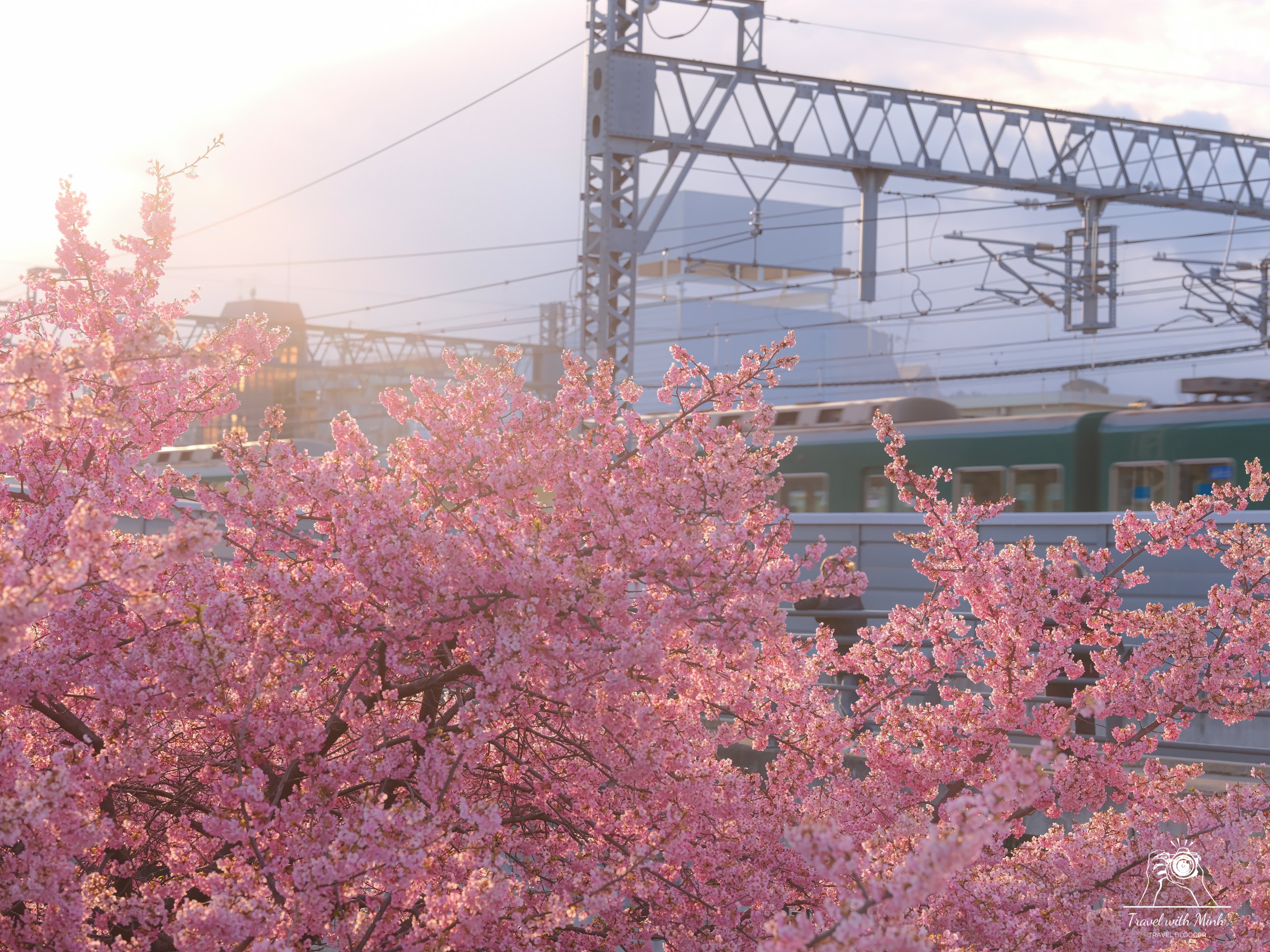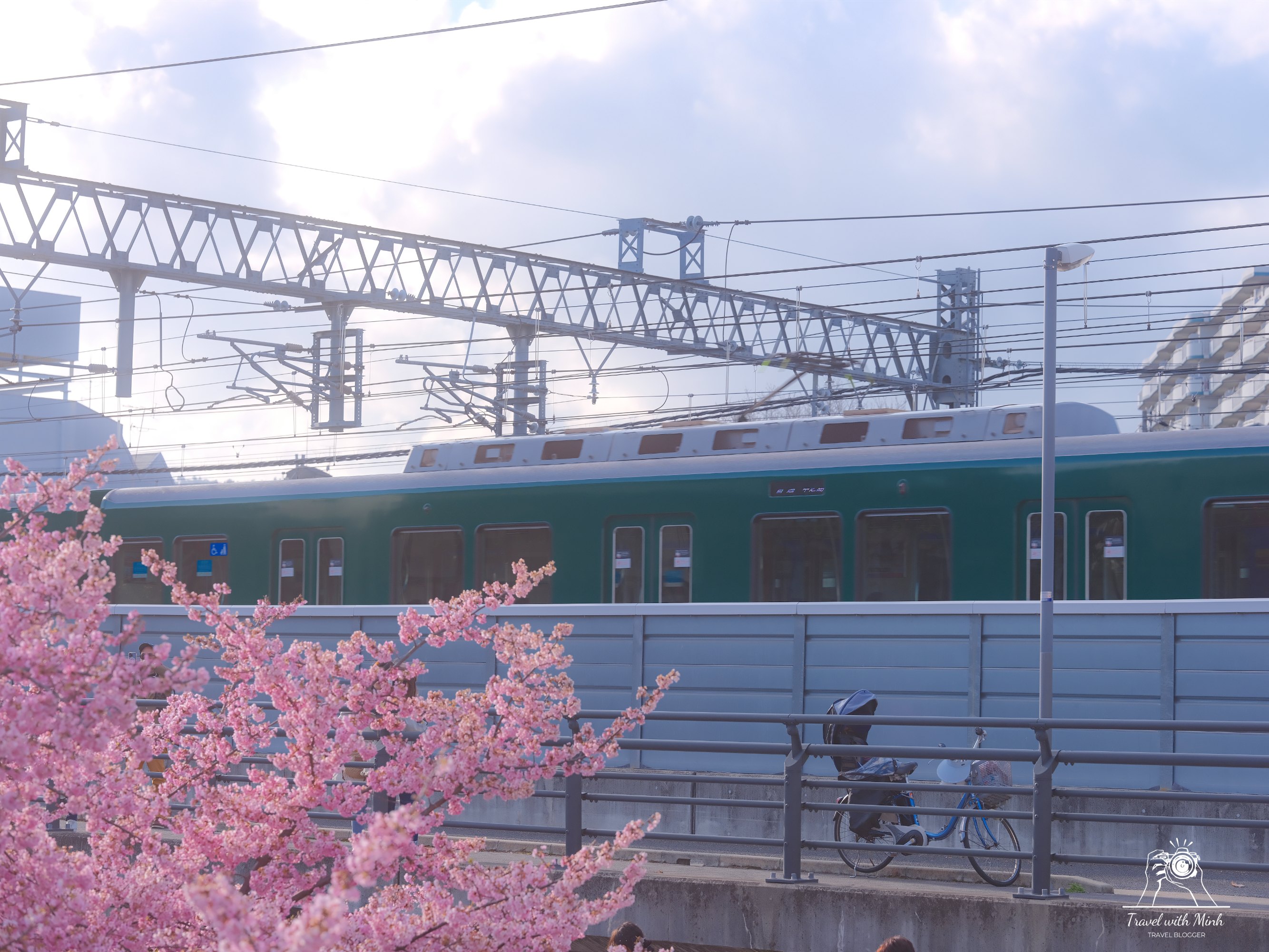 Một góc chụp cũng rất đẹp và không nên bỏ qua, đó là chụp hoa anh đào cùng với những con tàu chạy qua.