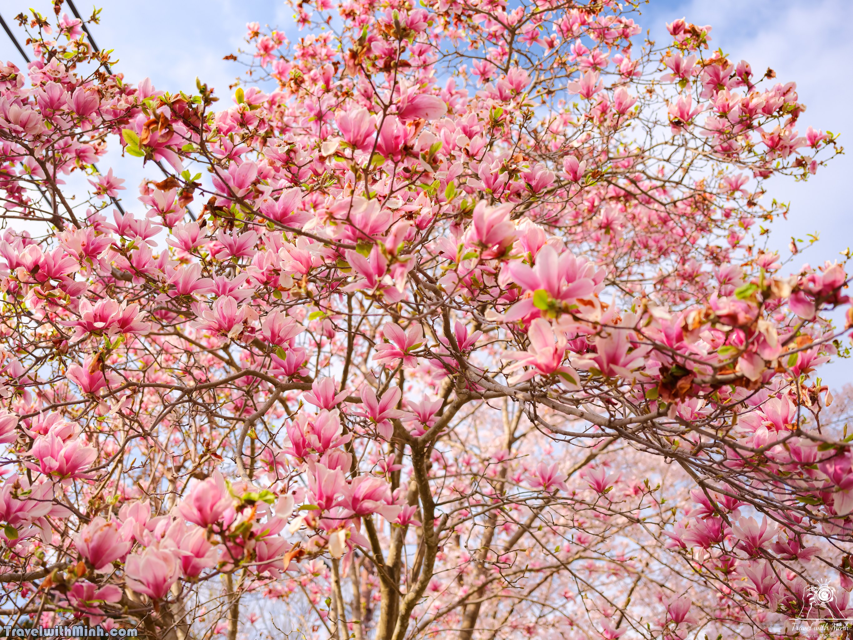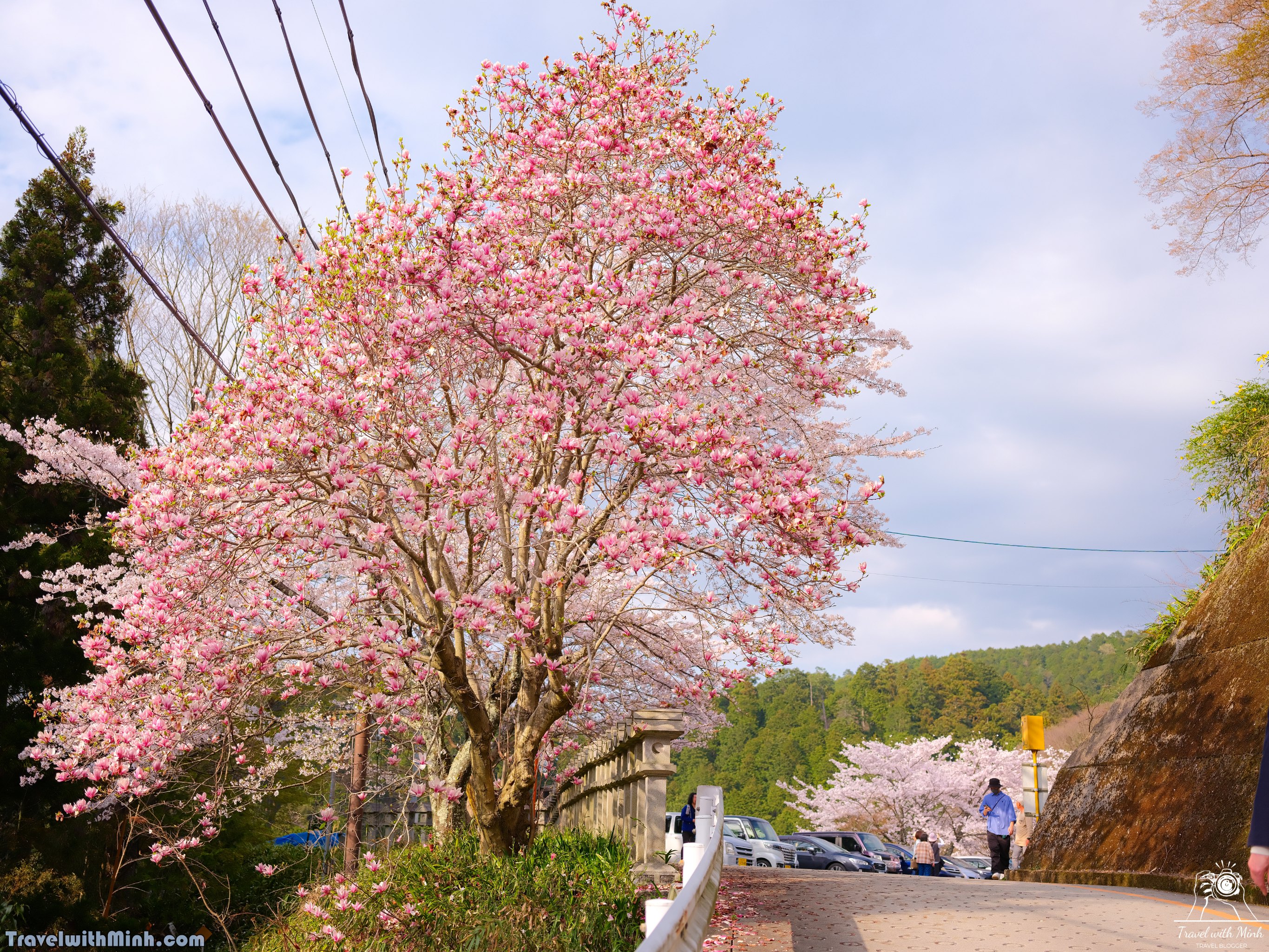 Sau khoảng 30 phút đi bộ thì đây là cảnh tượng đầu tiên mà mình nhìn thấy. Môt cây hoa mộc lan (Mokuren) màu hồng khổng lồ ngay trước lối vào.