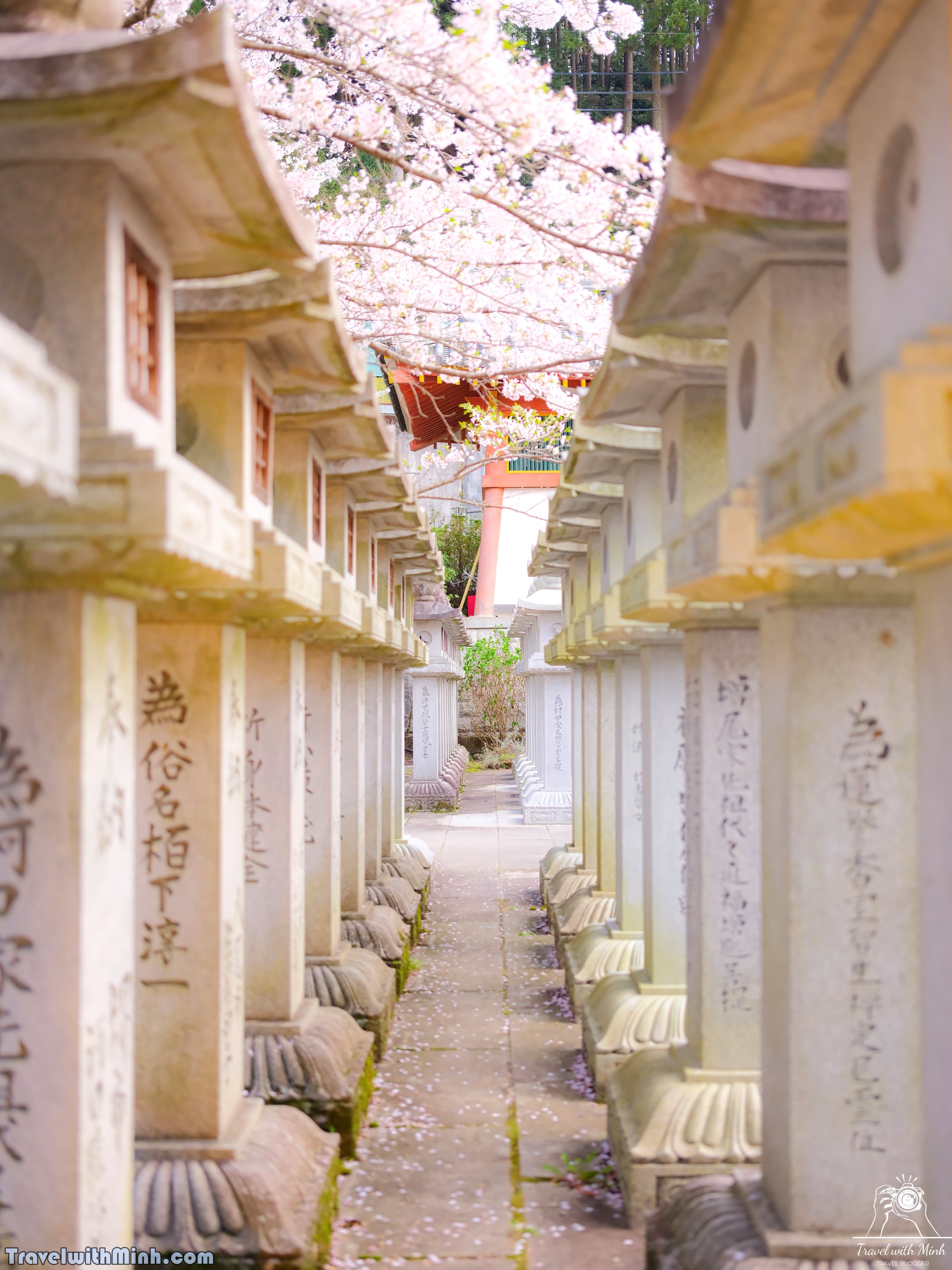 Ngay từ những bậc thang đầu tiên, mình đã thấy một hàng dài các cây anh đào hồng, kéo dài tới tận cuối con đường. Phía cuối cũng là ngột ngôi đền với cổng Torii nhỏ.
