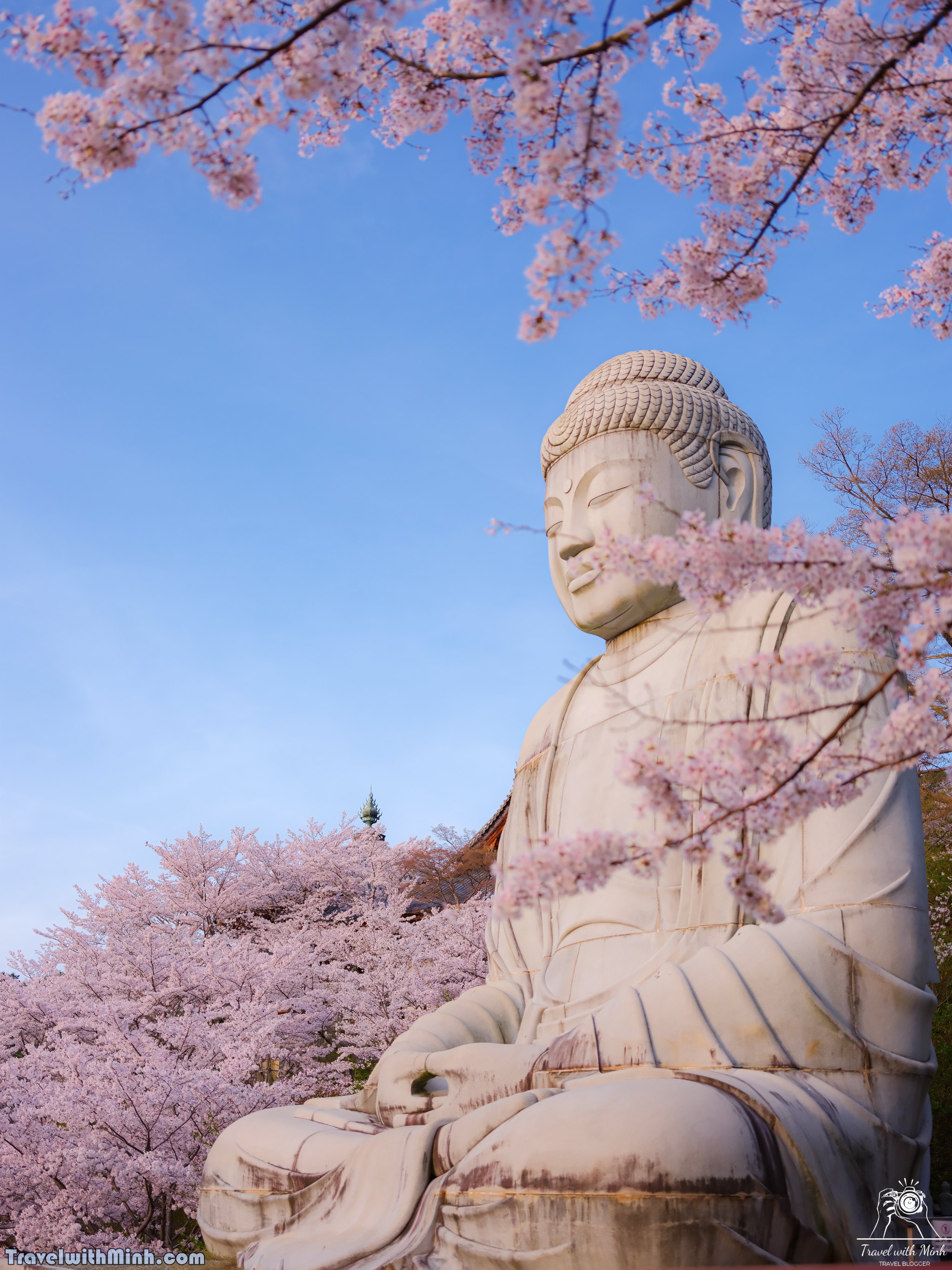 Góc chụp ảnh nổi tiếng nhất của ngôi chùa: Đại Phật bên hoa anh đào.