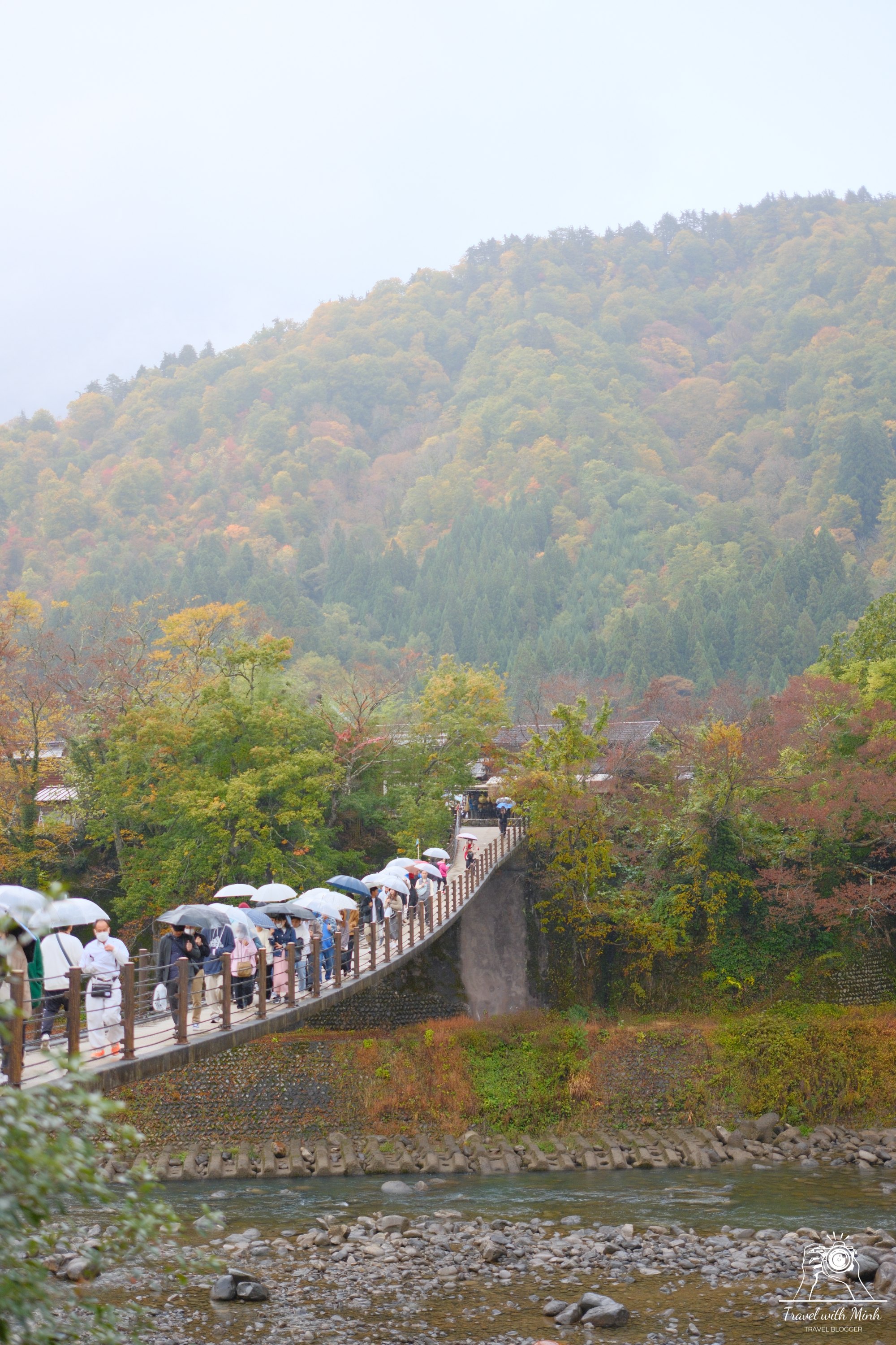 Đầu tiên, chúng ta sẽ phải băng qua cây cầu treo Ogimachi dài 107 mét, để đi từ bãi đỗ xe tiến vào trong ngôi làng.