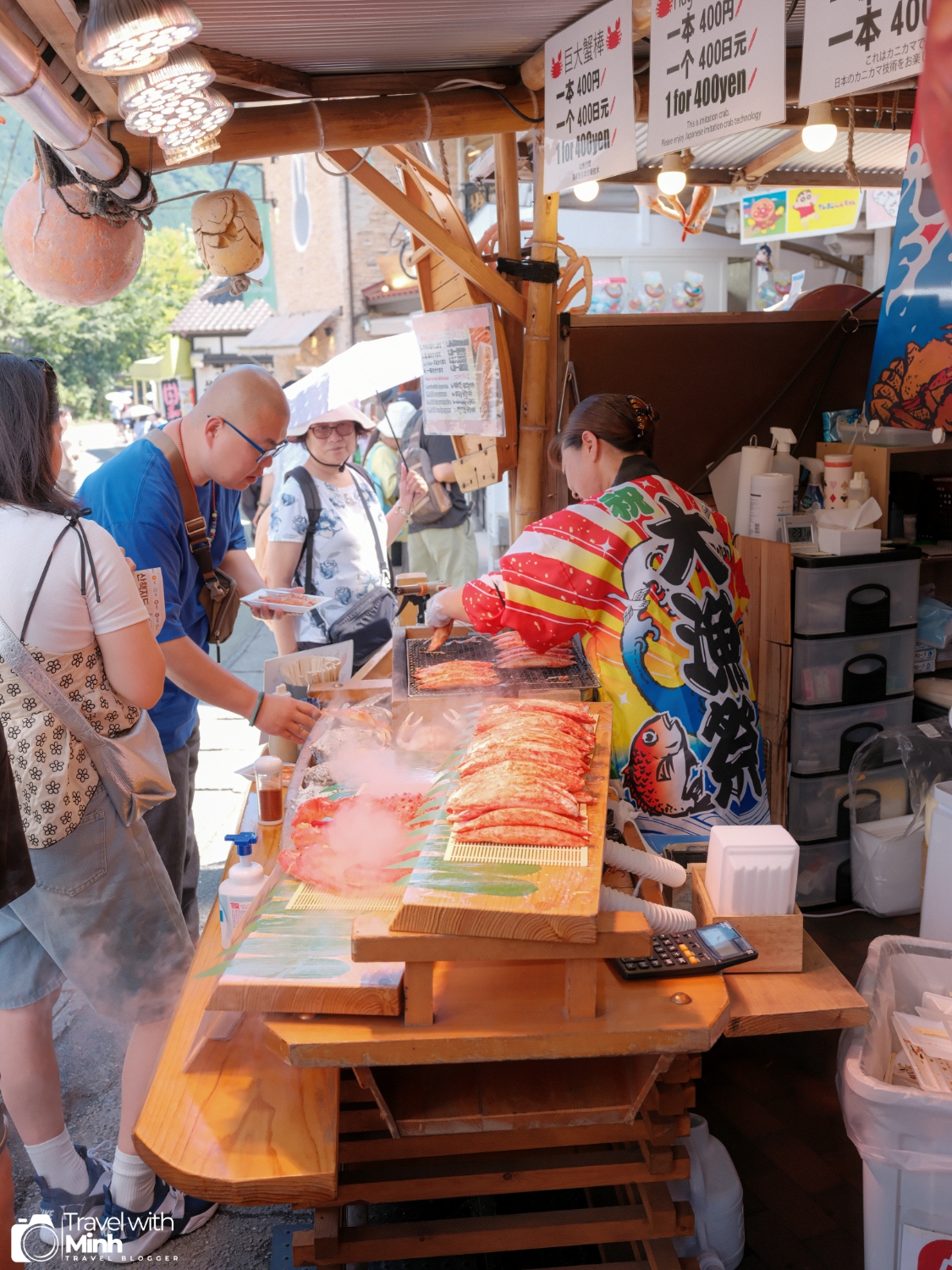 Một quán bán thanh cua nướng bên ngoài Yufuin Village