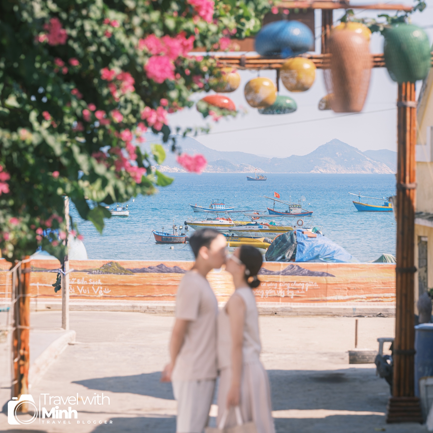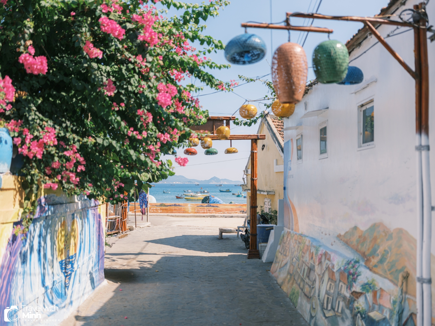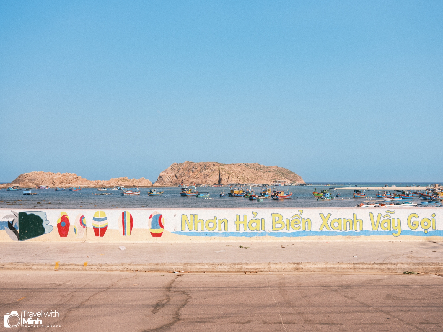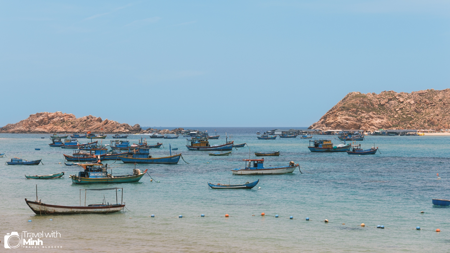 Làng chài Nhơn Hải với biển xanh, nắng vàng, cùng với hàng trăm con thuyền đánh cá đang neo đậu tạo nên khung cảnh rất yên bình.