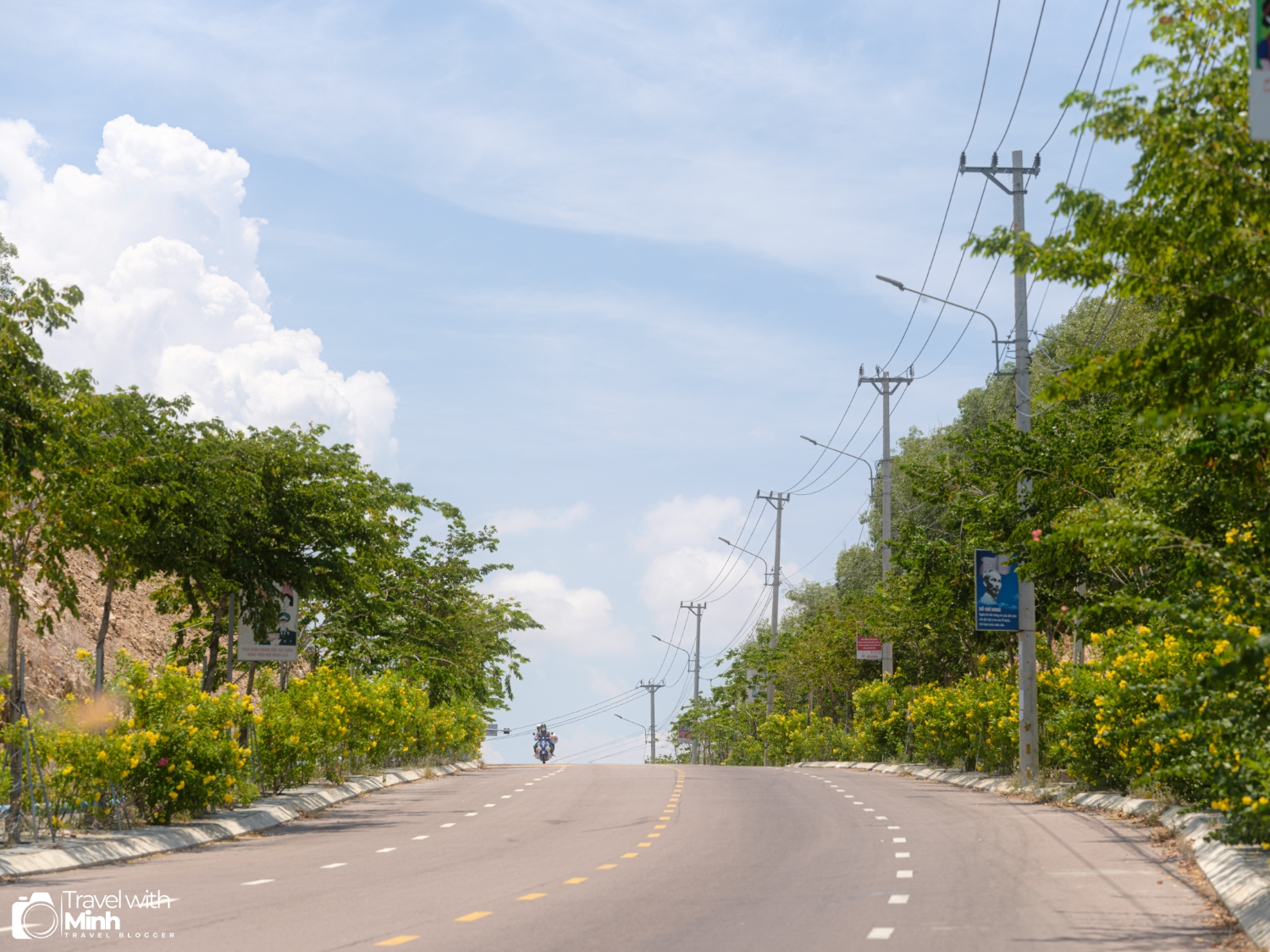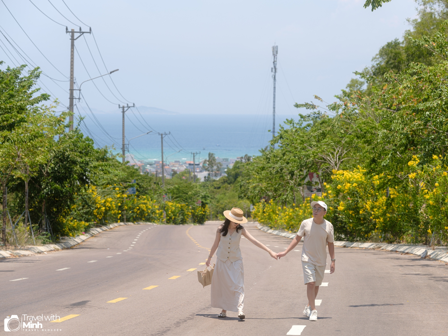 Trên đường tới làng chài Nhơn Hải, mình đã đi qua một con dốc cực đẹp, nhìn thẳng ra biển phía xa, cùng với hàng hoa vàng mọc hai bên đường.